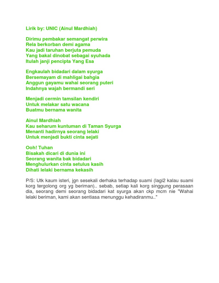 Lirik Lagu Unic Ainul Mardhiah Lirikinsekuy
